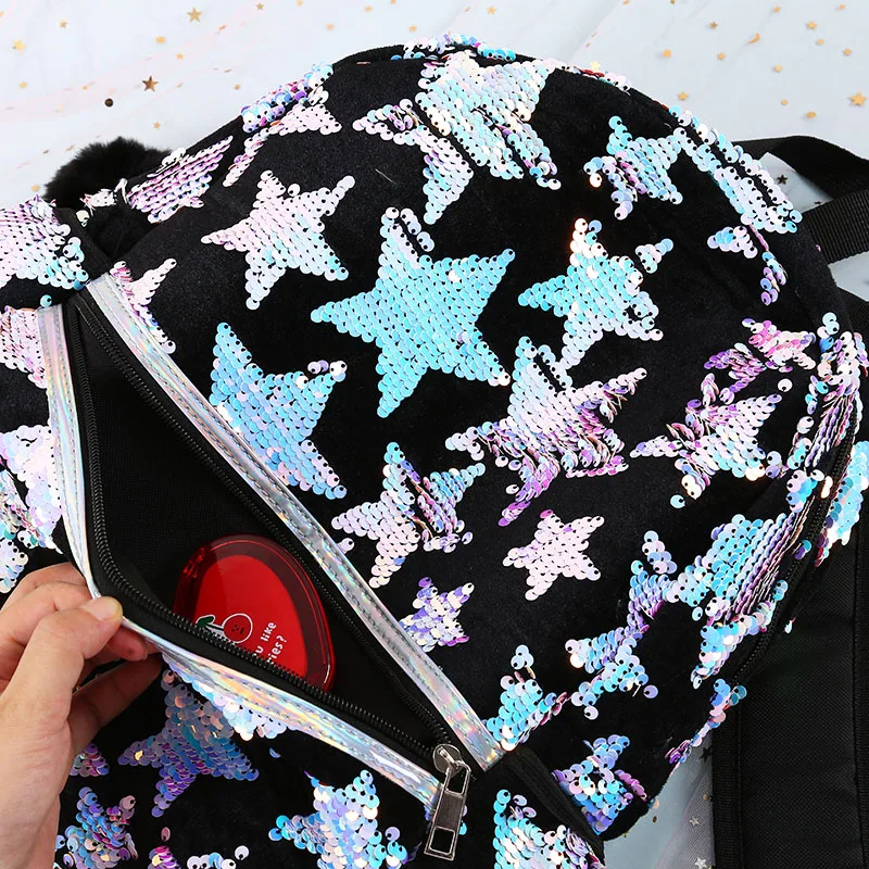 Women Sequin Star Large Backpack Fashion Black Travel Bag Student Fur Zipper Schoolbag Winter New P