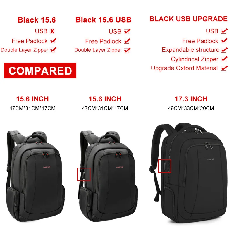 [32323897371] Compared:1. Model 15.6inch: NO USB, with padlock2. USB 15.6inch: with USB, with padlock3. USB Upgrade: with USB, with padlock, with expandable structure Feature:1. Selected splashproof high quality material2. Anti theft double layers zipper, Anti theft free padlock3. Large capacity, Earphone hole design4. External USB charging port, only USB port, power bank not included5. Expandable structure design: only "Upgrade" including